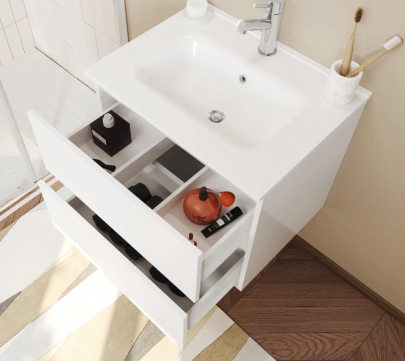 Mobilierul are fronturi din MDF infoliat cu PVC, lateralele fiind din PAL (vopsit UV). Cele doua sertare sunt incastrate si prevazute cu inchidere soft close.